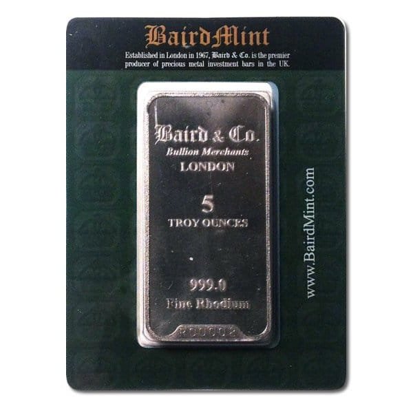 1/2oz Rhodium Bar The Baird & Co. 1/2oz rhodium minted bar is produced at Baird & Co internationally recognised London refinery. This bar is produced to the internationally recognised 999. standard and carries the Baird & Co. mark, the weight, fineness and a unique serial number. Bars are supplied in sealed, tamper resistant packaging.