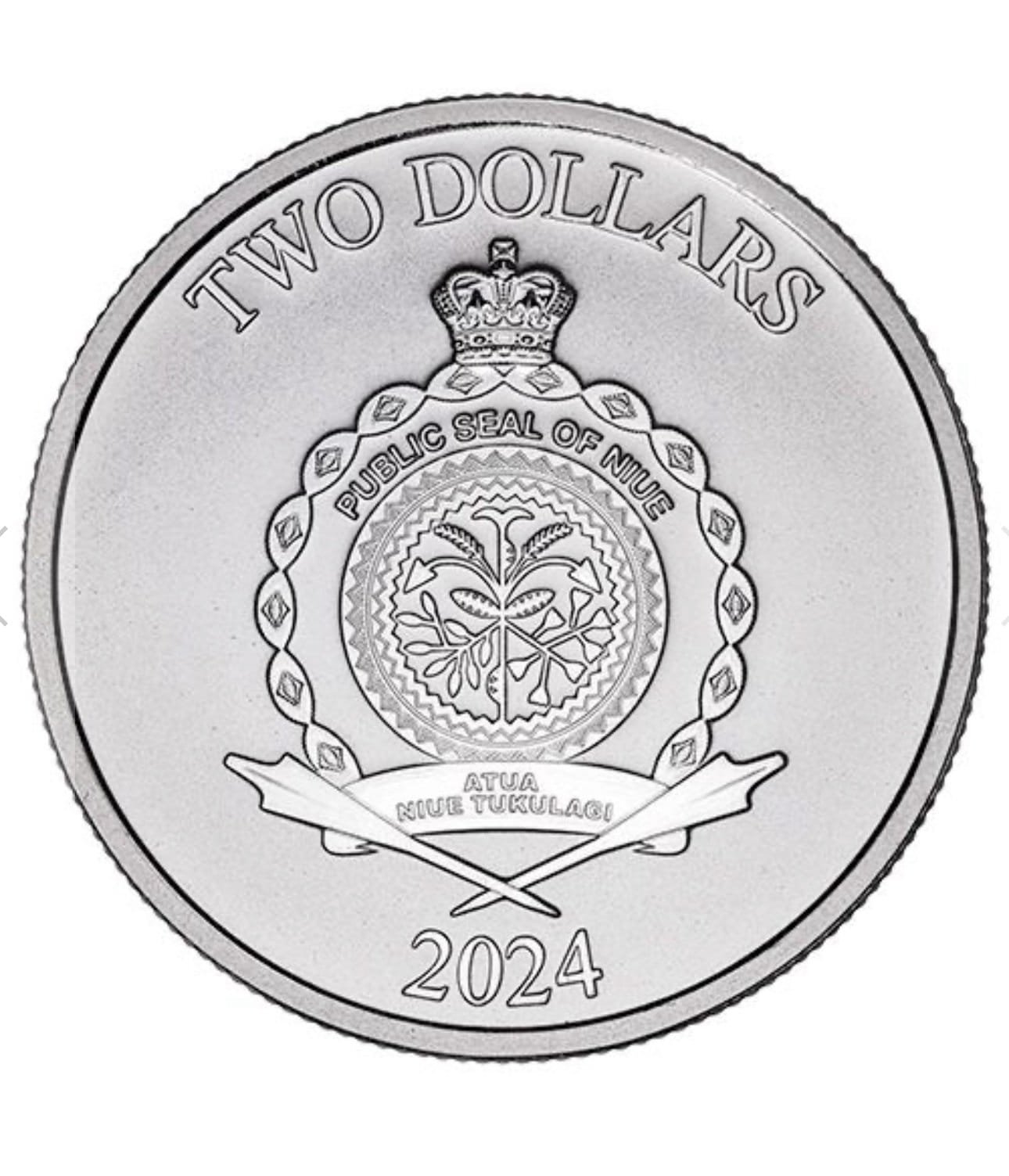 The Coat of Arms of Niue, the nation that ensures the coin’s legal tender status, is stamped on the obverse. The seal is accompanied by the inscription “TWO DOLLARS” and the year of issuance.